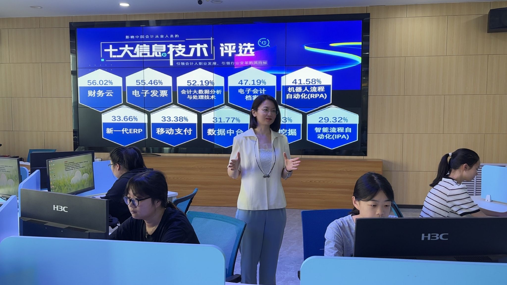 备赛期间,白玉翠以高度的责任感和使命感全身心投入。她深入研究专业人才培养目标与行业发展趋势,精准把握大赛要求。为了将智能财税前沿技术与课程教学深度融合,她与团队反复研讨,白天深入企业调研实际工作场景,收集真实案例;晚上加班加点设计教学方案,常常工作到深夜。在课程设计环节,她大胆创新,将传统的会计教学与大数据、人工智能等新技术相结合,打造出“理论 实践 数智化”的新型教学模式。为了让学生更好地理解复杂的业财税工作流程,她运用虚拟仿真技术,构建了高度还原企业财税工作的虚拟场景,让学生在沉浸式学习中掌握专业技能。