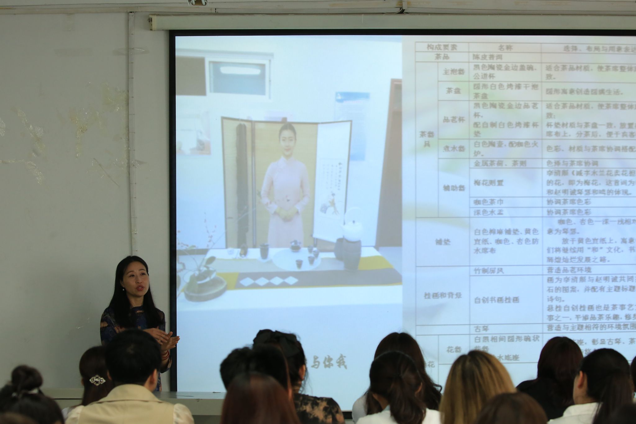 茶艺与茶文化课程以充满仪式感的茶艺修习过程为主线,运用茶礼、茶道精神,培养学生的审美情趣,提高个人修养、提升个人能力。在习茶过程,学生从踏着音乐进入茶艺教室开始,到悉心对待茶器、调息凝神专注泡茶,再到学生互相敬茶品茶、分享习茶感受等环节,让学生体验到无形的精神力量,同时授课过程中非常注重学生能力和综合素质的培养。2017年随着实训条件的好转,张娟玲开发自创茶艺模块内容,将茶席设计与茶艺表演进行了融合,通过汇报表演的形式进行实践考核,节目创作、考核过程组织都交由学生完成,在主持人选拔、会场布置、节目衔接、评委邀请、节目器具准备等这些活动细节中,学生能力素养得到锻炼,也收获了自信心和成就感。2018级学生任文丽在课程总结中这样说:“茶艺课程使我行为举止礼仪礼节变得大方得体,学会了在做任何事情时去除杂念,要心平气和,不能做事急躁,我慢慢体会到了茶的美妙。‘酒满敬人,茶满欺人’,倒茶要倒七分满是茶道的基本,也是告诉我们做人要学会保留和谦虚,保留一份接纳别人对你批评和建议的空间。自从认识了茶艺、认识了张老师之后,让我重新认识了自己,不仅发现了茶艺的美、老师的美,还发现了我身上的美,成就感直线上升!”