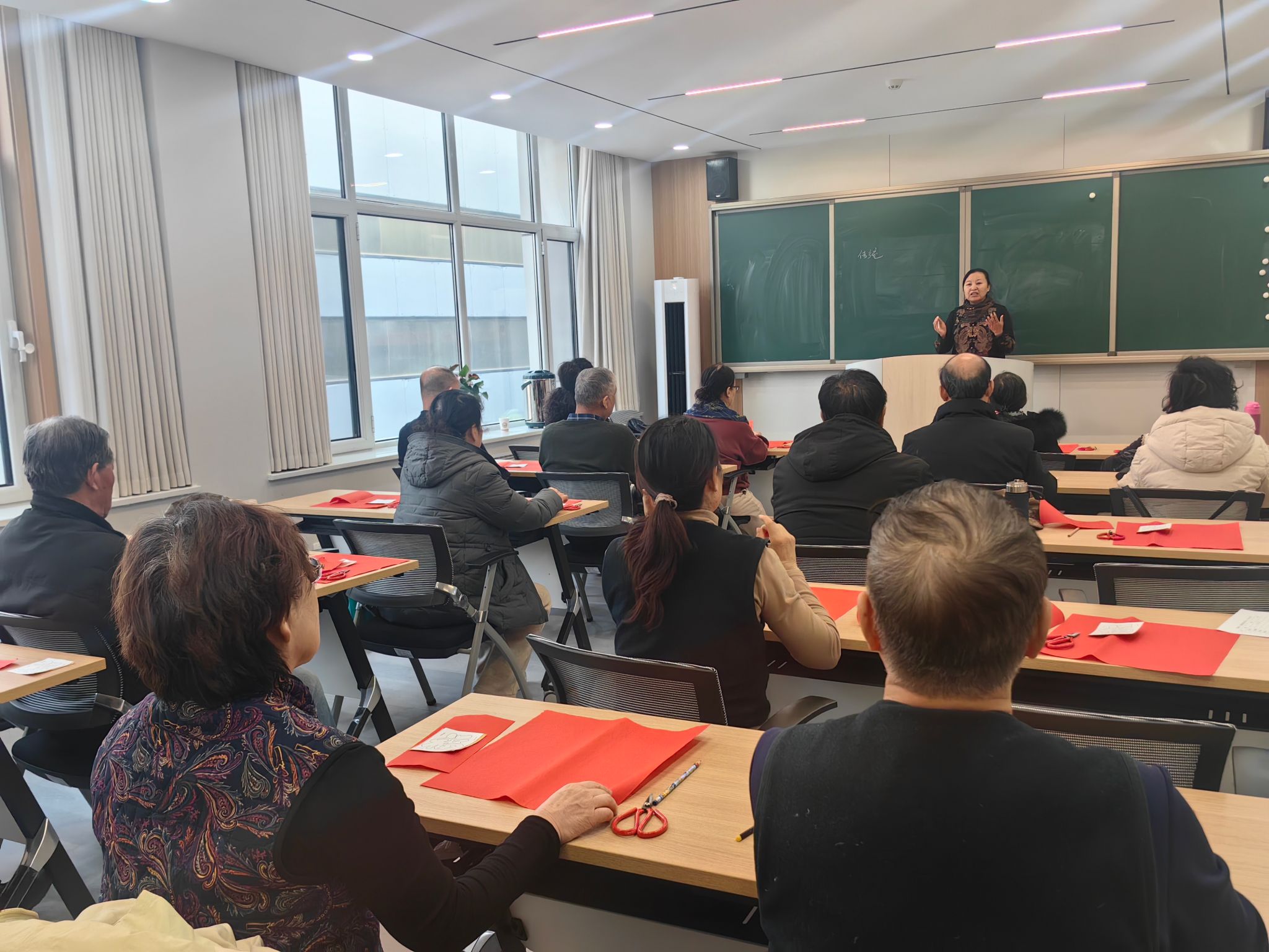 活动现场,王丽云老师亲自授课,从剪纸的历史渊源、基础纹样技法到创意构图方法,为学员们进行细致讲解。针对老年学员的学习特点,她特意选取了寓意吉祥的团花、福字等简易纹样,手把手示范“折、叠、裁、剪”等核心技巧,耐心纠正大家的操作细节。