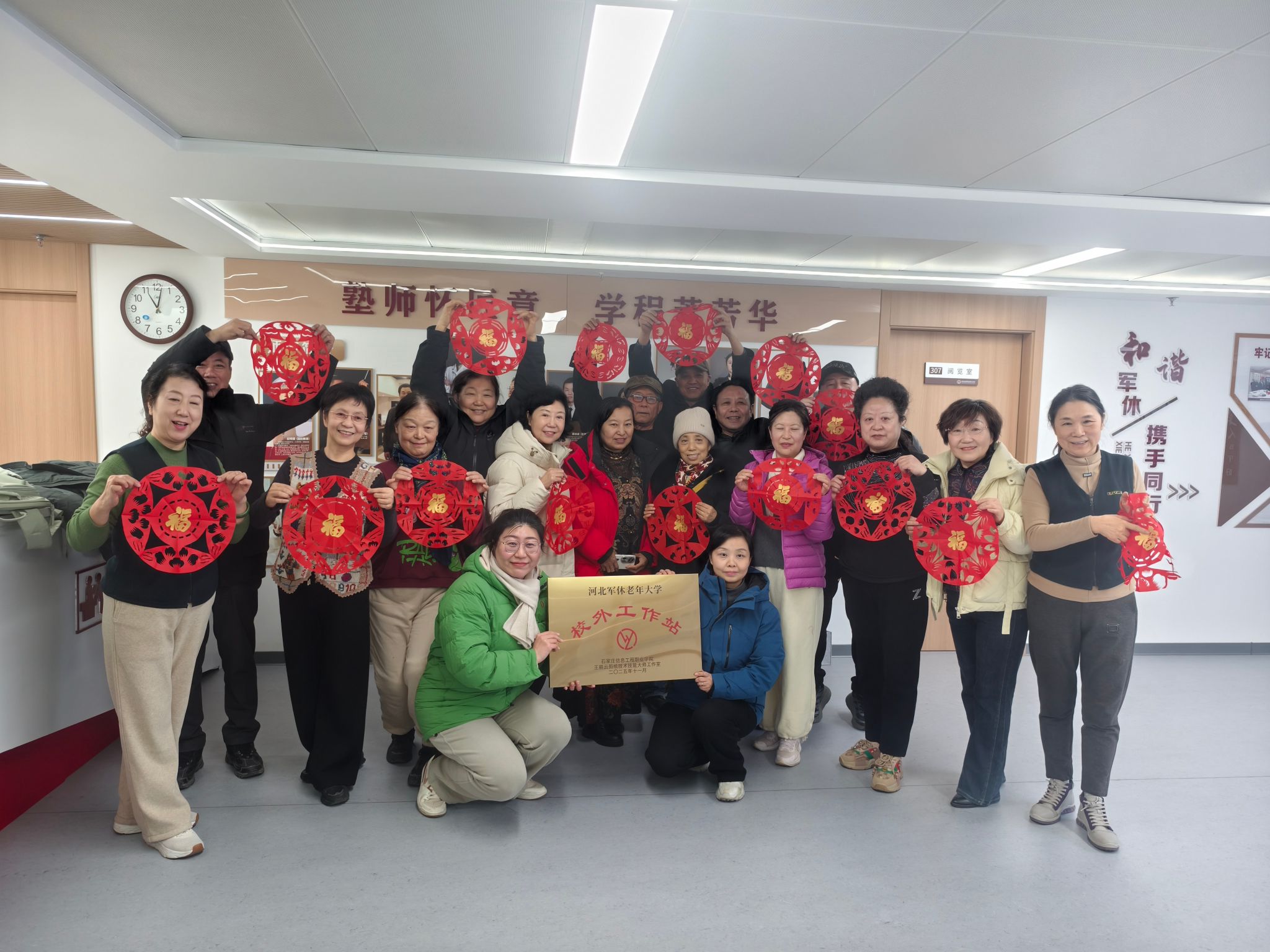 近日,传媒艺术系王丽云剪纸技术技能大师工作室河北军休老年大学校外工作站授牌仪式在河北军休老年大学隆重举行。河北军休老年大学相关负责人、王丽云剪纸技能大师工作室团队及学员代表共同出席仪式。我院团队将优质教学资源带入军休干部的精神文化生活,以文化赋能银龄时光,为军休文化建设注入新活力。
