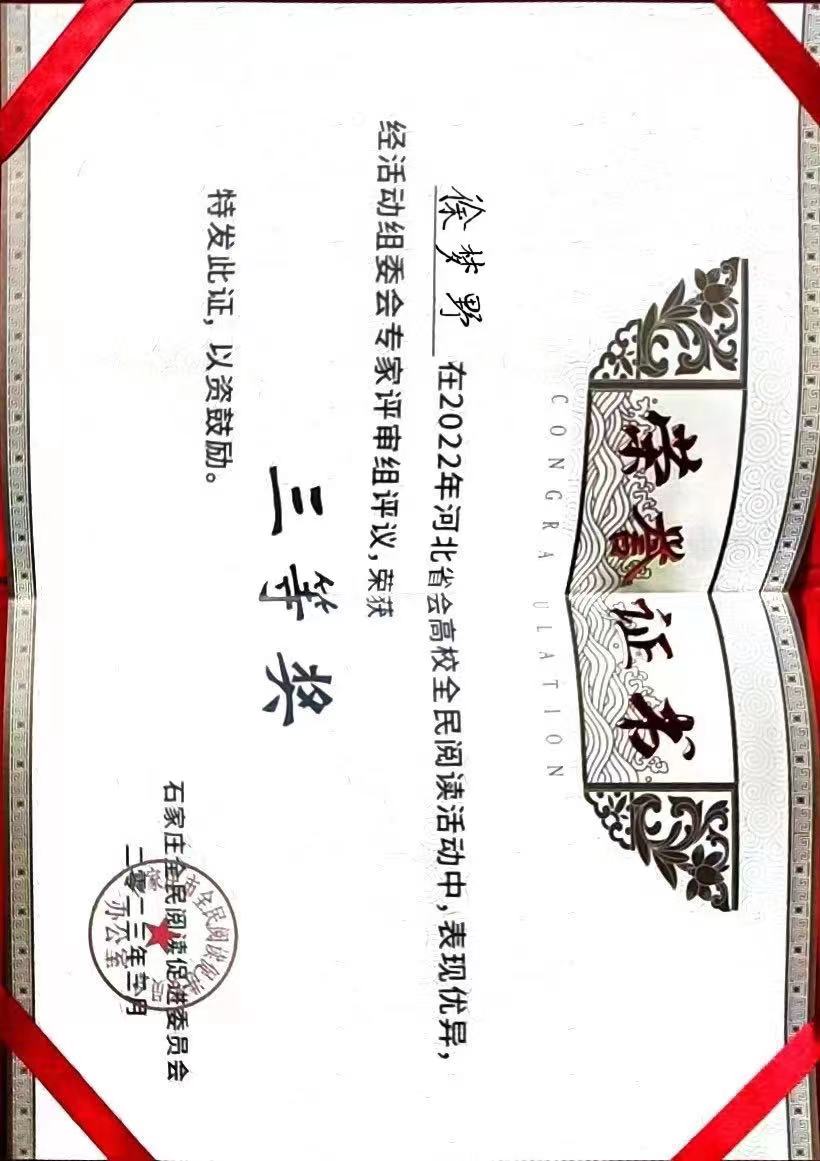 2022年“点燃梦想,阅读青春”省会高校青年阅读演讲比赛活动由石家庄市委宣传部与共青团石家庄委员会联合开展。经过初赛、复赛比拼,我院选手徐梦野从高校42名参赛选手中脱颖而出,并在决赛中荣获三等奖。