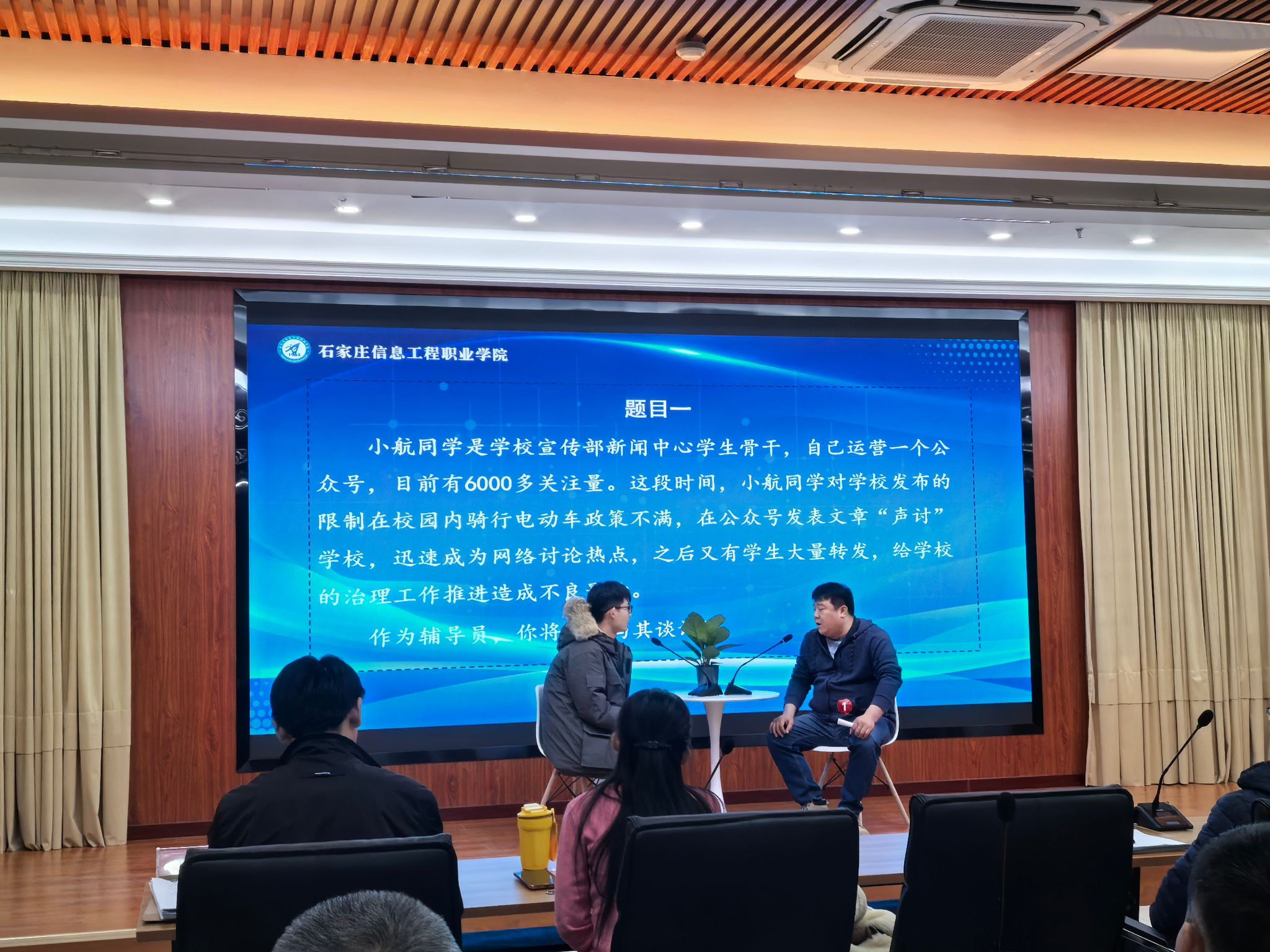 谈心谈话赛项中,辅导员与谈话对象进行情景模拟,还原日常谈心谈话工作中所面临的各类问题。谈话对象现场提问,辅导员们认真倾听,运用专业知识和工作经验耐心解答,教育引导,帮助学生树立正确的人生观、世界观和价值观。